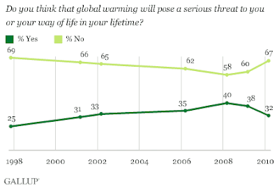 The American people seem to have noticed. The most recent Gallup Poll reflects that the hysteria fever has certainly cooled considerably. For example, 48% think global warming is “generally exaggerated,” up from 31% only five years ago. A whopping 67% don’t think it will pose a “serious threat” in their lifetimes, up 9% in only two years. But that’s the problem with false hysteria. Generating it is relatively easy, particularly when it is supported by the Establishment and the MSM. But maintaining the fear long enough to really change society, that’s a lot harder. And once the balloon springs a leak, it is really hard to reinflate.