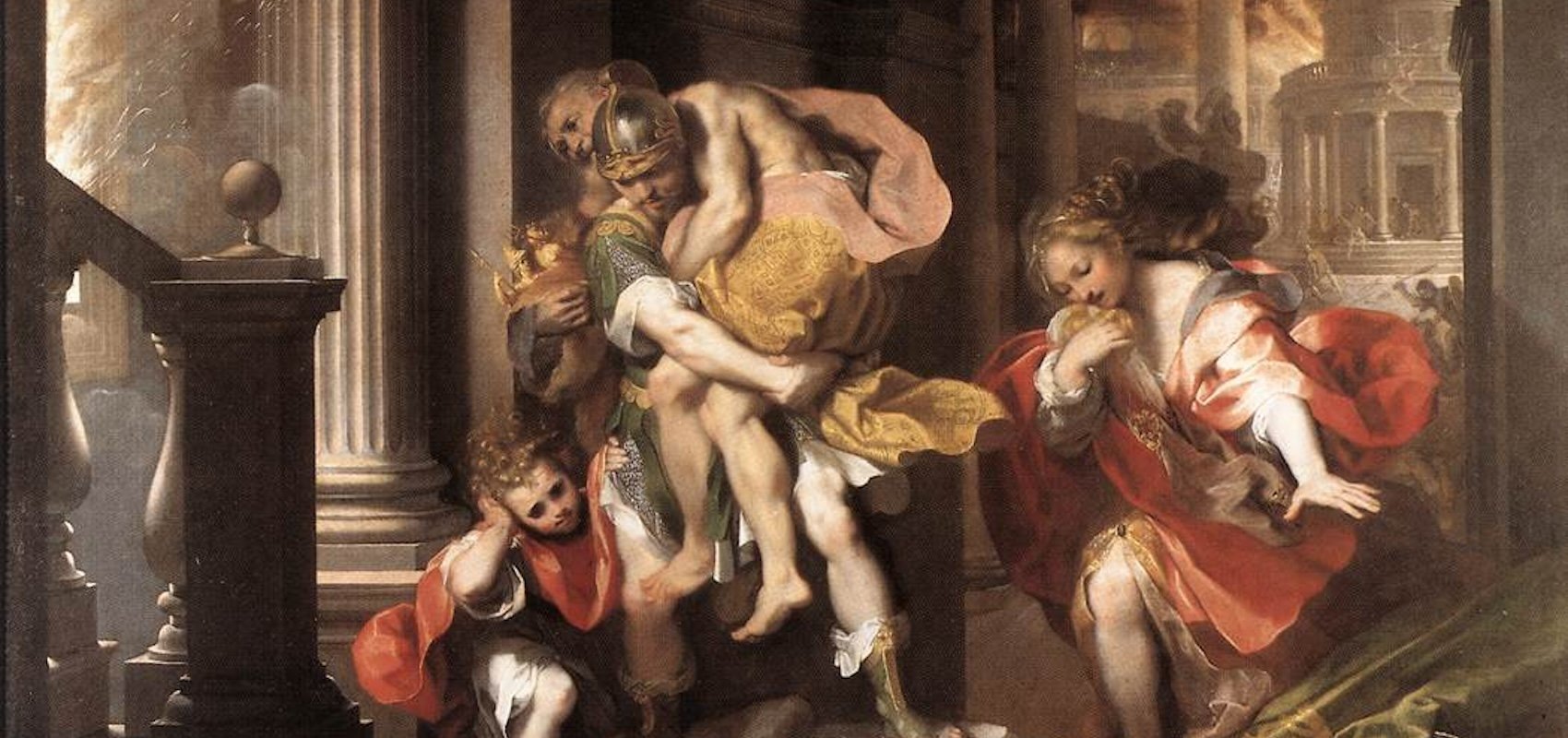 Virgil’s indelible image of Aeneas in flight from Troy, with Anchises on his shoulders and Ascanius toddling along behind, is a picture of courage as gratifying to the Roman mind as one could wish. “Pious Aeneas,” the dutiful son, salvaging his ancestral gods and following his father’s guidance, carries the future with him in the person of Augustus’s own ancestor. And yet Virgil has introduced an unsettling note of melancholy into the poem’s first crescendo. It becomes clear that this will not only be a story about the valor it takes to found a great civilization like Rome. It will also be about how much must be lost, left behind, and even destroyed if something new is to be built. The vacant look that Bernini sculpted into Aeneas’s eyes is the look of a broken-spirited veteran. It’s the look we imagine him giving to Dido, the beautiful queen of Carthage, when she asks him to tell the story of his escape: “unspeakable, oh queen, the grief you now command me to relive,” he says.