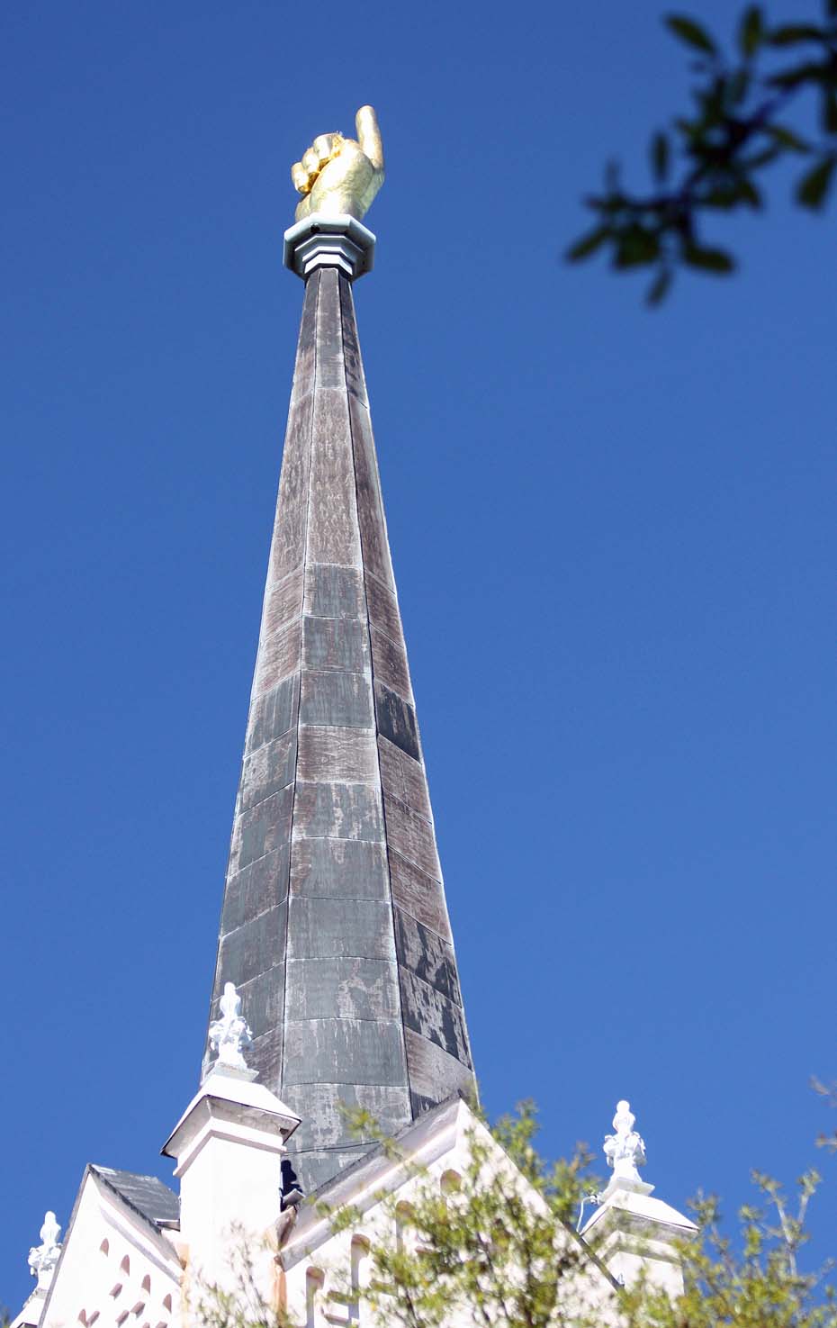 My favorite steeple is in Port Gibson, Mississippi, at the First Presbyterian Church. It ends not in a cross but in beefy gold-leafed hand that points the way to God. It’s not a cross, but it’s a testimony at least.