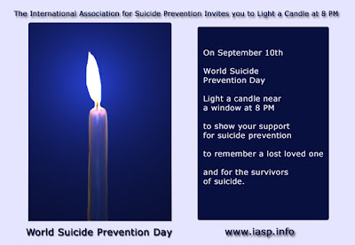 Some people have contacted us saying that they would like to meaningfully participate in World Suicide Prevention Day but cannot attend events or activities. This year we are starting a new activity which anyone can do in support of: World Suicide Prevention Day, suicide prevention and awareness, survivors of suicide and for the memory of loved lost ones. It is called “Light a Candle on World Suicide Prevention Day at 8 PM.” If you like this activity and know of family members, friends and associates who would be interested in participating, would you kindly share with them this WSPD activity? We are hoping this activity will bring light into the world and increase awareness of the good work so many people do in preventing suicide.