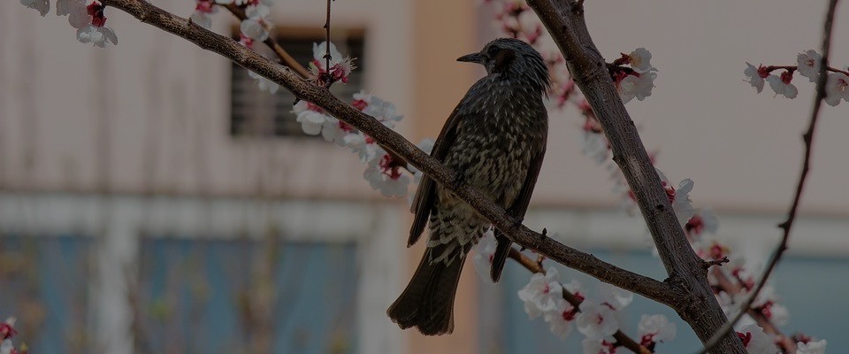 Into the cherry’s greening crown.