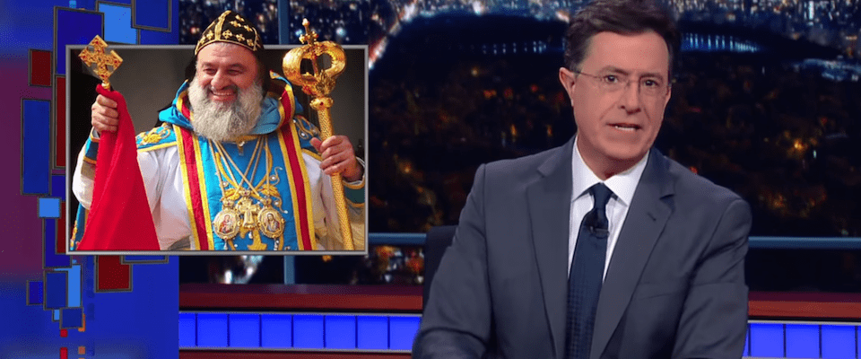 Republican candidates want to admit Syrian Christians, but not Syrian Muslims, Colbert says, because they think Americans can “relate to average Syrian Christians.” After all, Syrian Christians are “basically Methodists.” For example, he continues, with the cutesy irony that has made him rich and famous, consider Syriac Orthodox Christians. They say something called the Ramsho prayer every evening—“Ramsho prayer,” incidentally, is how you say “Vespers” in Syriac—and read their Bibles in Aramaic. He continues with what he apparently thinks is a hilarious sendup of the Syriac Orthodox patriarch, His Holiness Ignatius Aphrem II. Flashing a picture of the patriarch in his liturgical robes, Colbert jokes that the vestments make Ignatius look like “Golden Snake Santa Pope,” a comic figure who would fit right in as King of Mardi Gras. Colbert’s piano-playing sidekick joins the audience in guffawing.