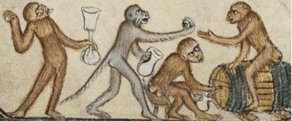 Medieval depictions of the devil often resemble apes. As Florence McCulloch says (Medieval Latin and French Bestiaries), “the ape symbolizes the devil who had a head but no tail; that is, he has a beginning when he was in heaven, but because of his inner hypocrisy and deceit, he lost his head.” For some, the devil is an ape because he “moves those who do evil, and will carry them in front of him to hell, where he leaves the good at his back with God” (87).