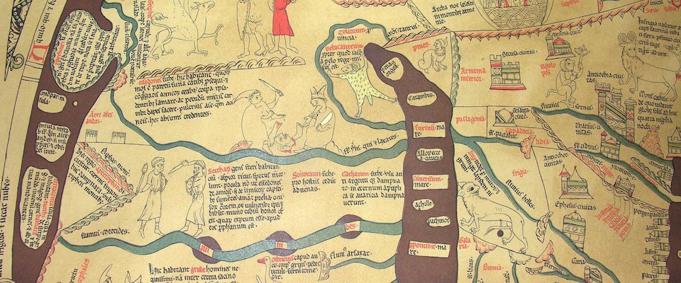 Modern maps elide worldview. Not medieval maps, which, whatever the makers thought about the real configuration of the terrain, depict a vision of the world, typically a Christian one. Maps were made in a T-O format - circular overall, but with a T formed by the intersection of Asia, Europe, and Africa. Jerusalem is at the center of the T on many maps, sometimes with the risen Christ in the center of Jerusalem. At the margins are monsters, the evil that stalks the edges of human life. In the fourteenth-century Hereford map that Deam explores most fully, there's a picture of St Augustine in north Africa.