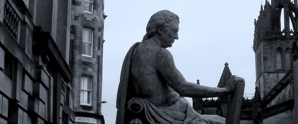 He explains Hume's epistemology: “We have only these perceptions – he called them impressions – with which to construct our sense of the outside world. These impressions, argued Hume, imprint themselves on our mind and, when repeated, form ideas. An idea is an aggregate of confirmed impressions – that, for example, the sun in the morning will feel warm on my face. We do not build our understanding of the outside world logically (Hume criticised the concept of cause and effect), but by impressions accumulating into ideas. Each, said Hume, recalls the other. There is a flow between the two.