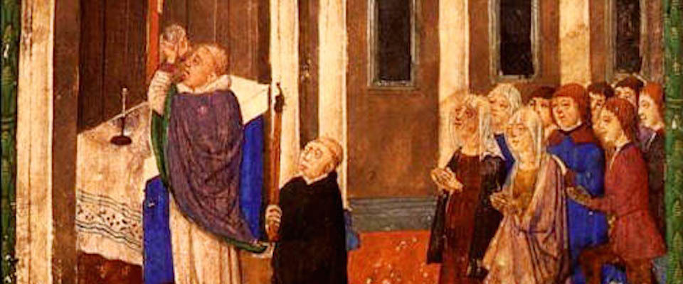 By the end of the middle ages, a new punctuation had shifted: [Historical body - Sacramental body] / Ecclesial body. Here, the link between the historical and sacramental body is the key issue: How is the Christ who was incarnate, lived, died, rose, and ascended, present in the sacramental body? The fact that the sacrament was at the center of a gathered ecclesia was no longer the main concern of Eucharistic theology. This new punctuation was reflected liturgically: The ecclesia stood at a distance watching the priest consecrate the bread so that the sacramental body became the very substance of the historical body.