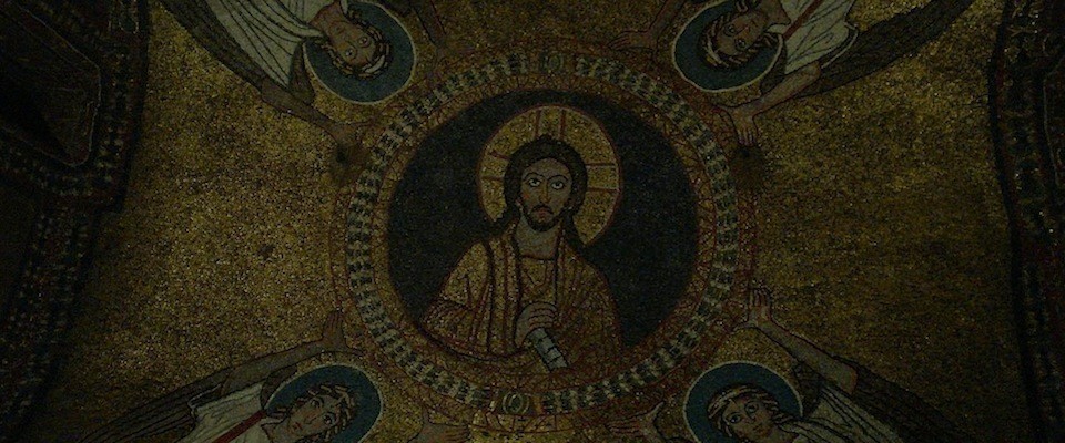 Paschal’s architectural aesthetic focused on light: thus the nave was lined with 24 clerestory windows through which the sun’s rays streamed before dancing off the small glass tiles of the ornamentation. The apse mosaic took its inspiration from the Basilica of Sts. Cosmas and Damian: against a mesmerizing blue sky, a golden-robed Christ floats under the hand of God. Peter and Paul flank him, wearing senatorial togas; Praxedes and her sister Pudenziana, holding their crowns of martyrdom, are embraced by the apostles and guided toward Christ. . . .