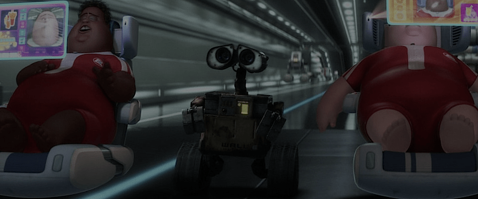 But the earth proved uninhabitable, and the robots are abandoned. One surviving Wall-E becomes sentient and falls in love with a female robot. Eventually, through a series of adventures, they induce the humanswho all have become morbidly obese and so lazy they don’t even walkto return to devastated earth and plant a tree. The planet is saved! Humankind has learned its lesson: From then on, we will live simple and green.