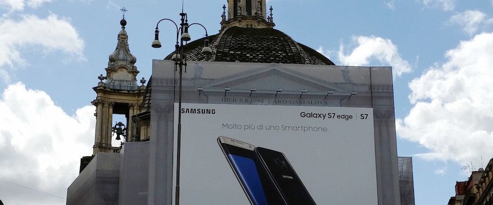 Take a look at the photo on the left. It’s a famous church in Rome, the seventeenth-century Santa Maria dei Miracoli, on the Piazza del Popolo. You might not immediately recognize it as a church because its front is almost entirely obscured by a giant billboard. Santa Maria is under renovation, and I assume the church, or perhaps the city, has rented out advertising space on the scaffolding to defray costs. Santa Maria remains a functioning place of Christian worship. The miraculous icon of the Virgin, for whom the church is named, still hangs above the altar. But the giant advertisement outside for Samsung’s new Galaxy S7 Edge—which, the billboard assures us, is “Molto più di uno Smartphone”—makes that fact hard to discern.